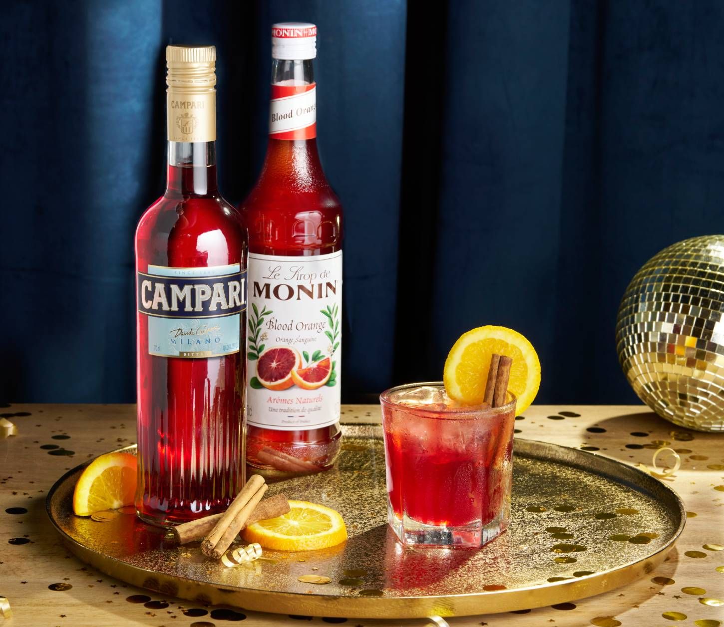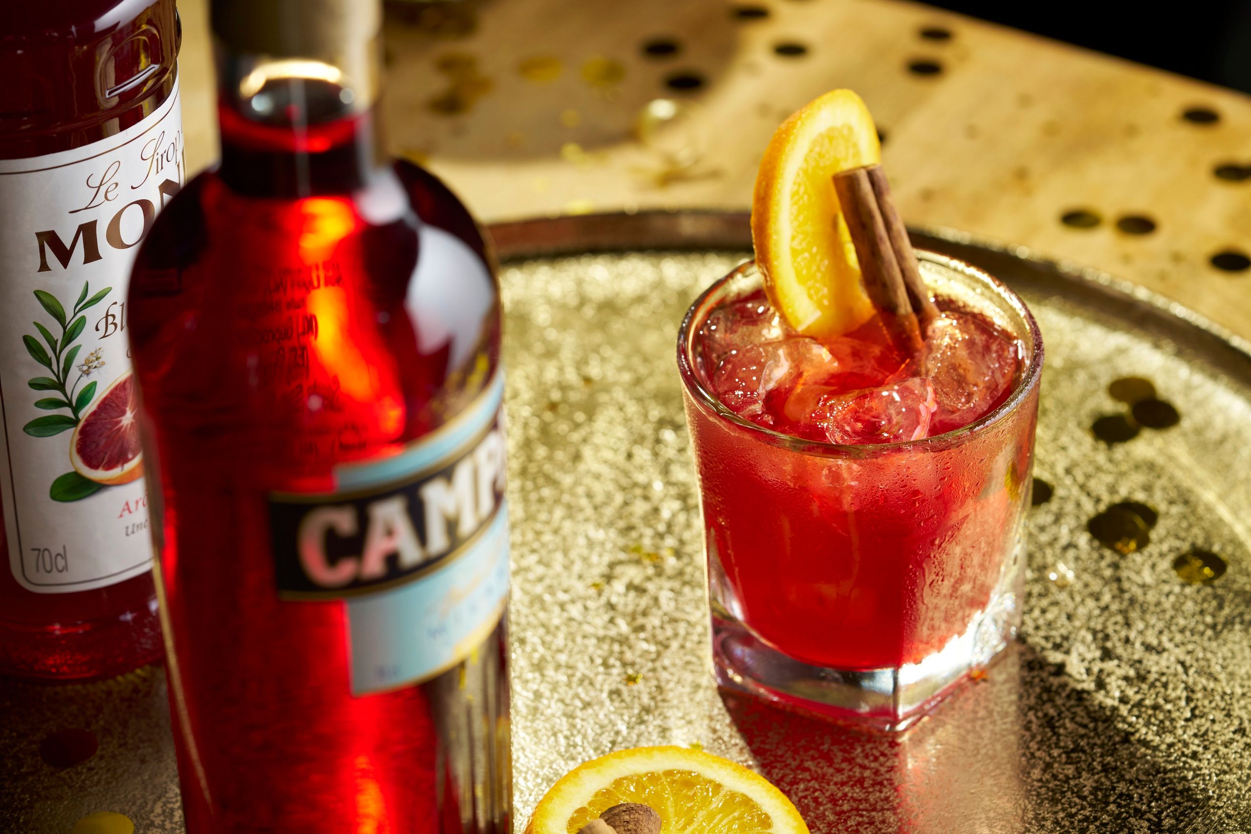 Equally rich in colour and flavour, our Ruby Refresher is a magical mix of Campari, Monin Blood Orange Syrup and cranberry juice, topped with soda water for a dash of fizz. Garnished with an orange wheel and a cinnamon stick to finish off this sparkling jewel.