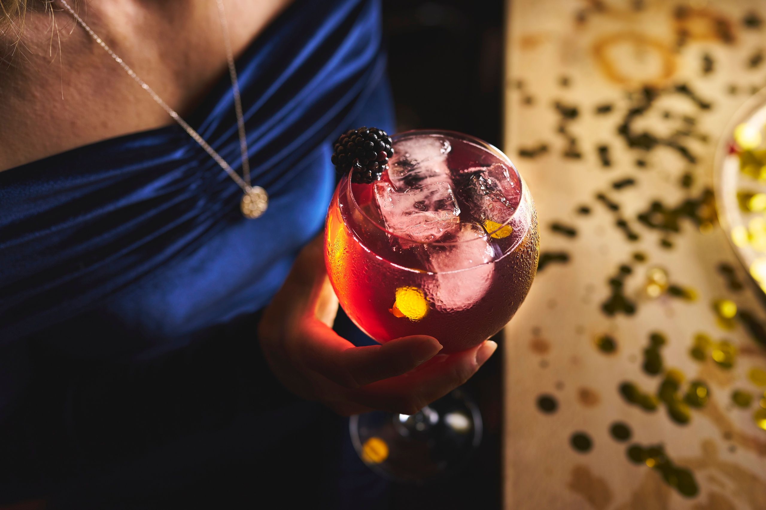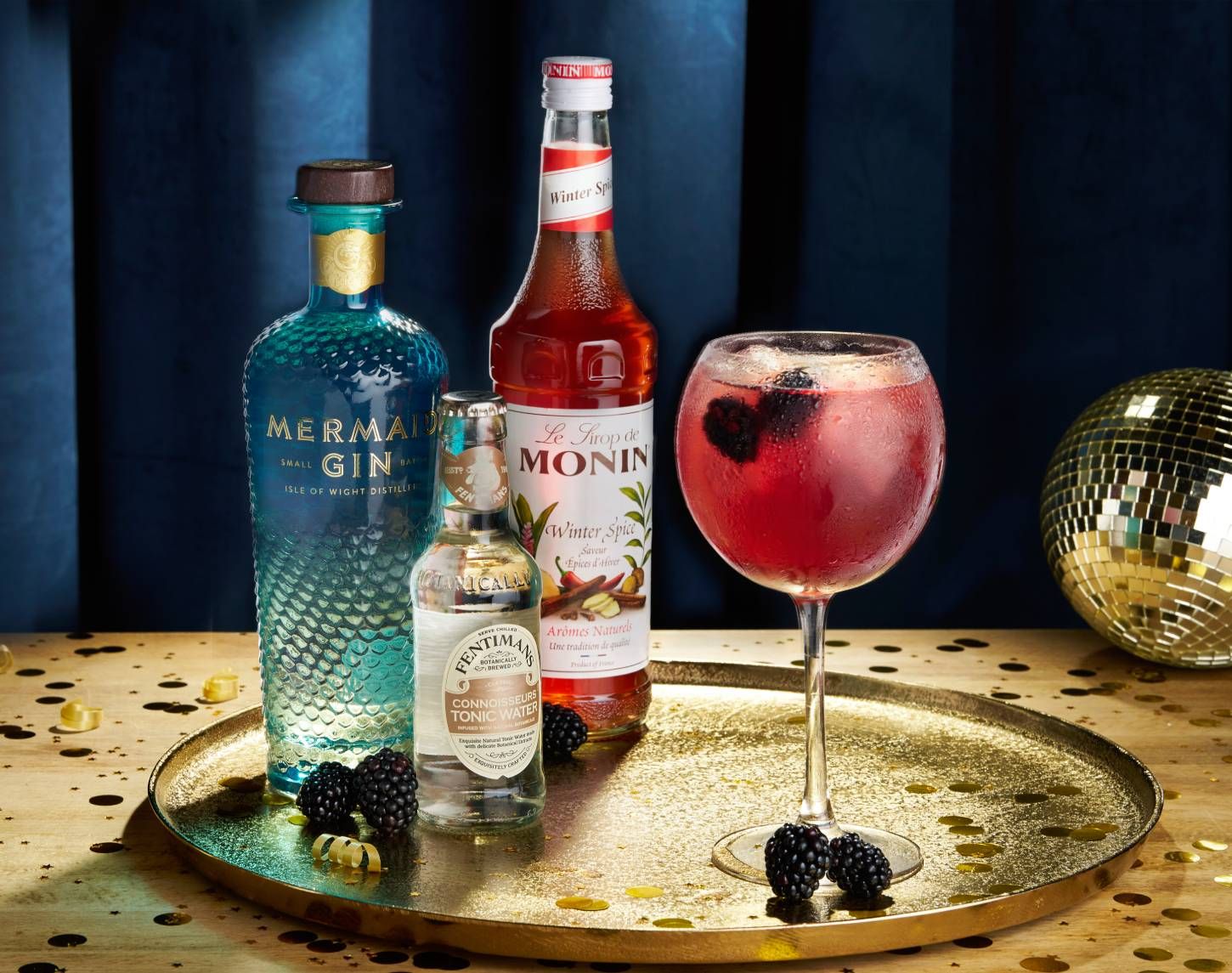 A jewel-toned delight of Mermaid Gin, Monin Winter Spice Syrup and Fentimans Connoisseurs Tonic, with a dash of Crème de Mûre and a topping of blackberries. A delicate blend of berry fruit and traditional winter spices, and a total crowd-pleaser.