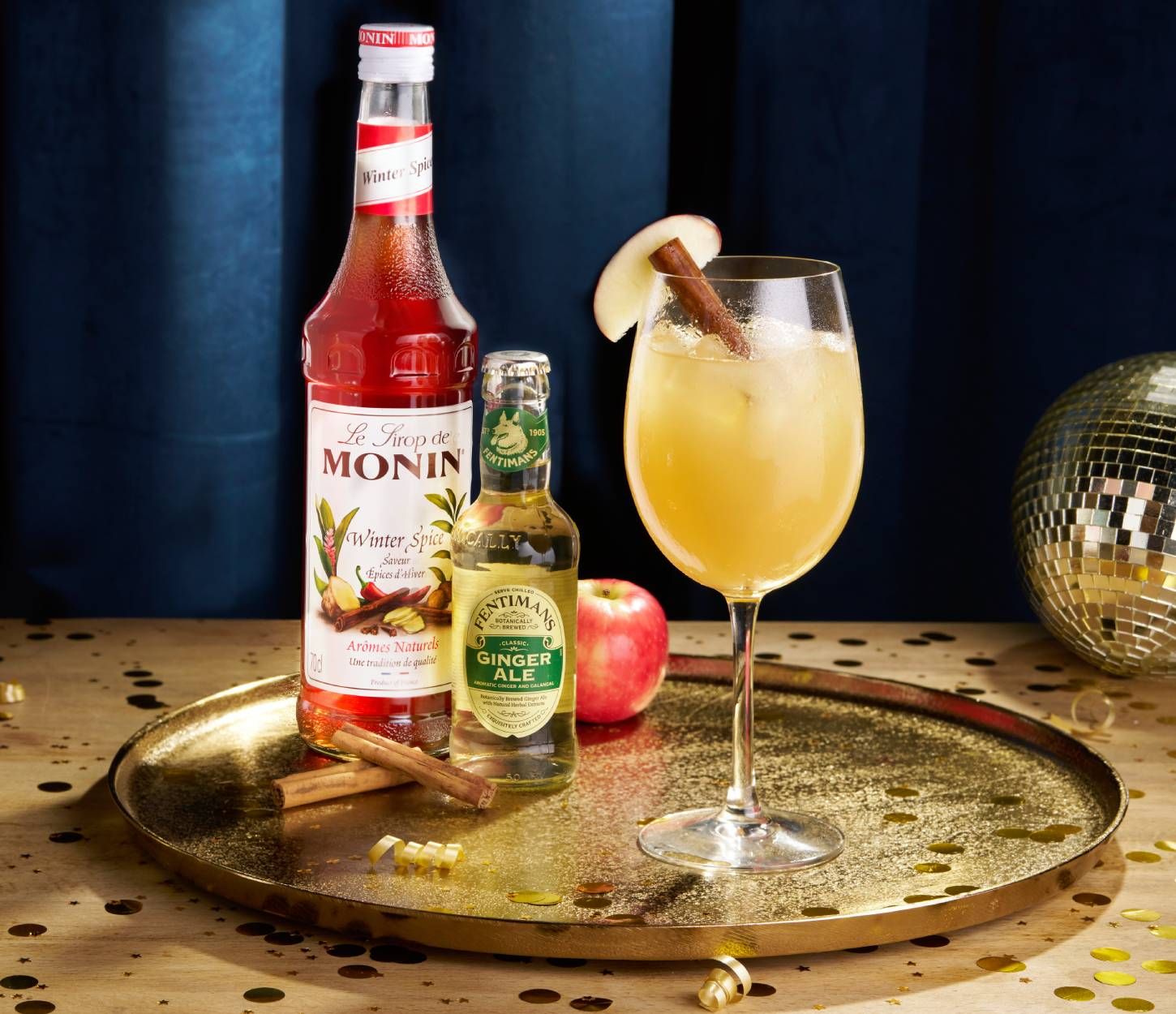 This gorgeously golden mocktail pairs Fentimans Ginger Ale, Monin Winter Spice Syrup and cloudy apple juice to form a true taste of spiced apple pie in a glass. Topped with a slice of apple and a cinnamon stick, our Golden Gala is a dreamy blend of nostalgia and comfort.